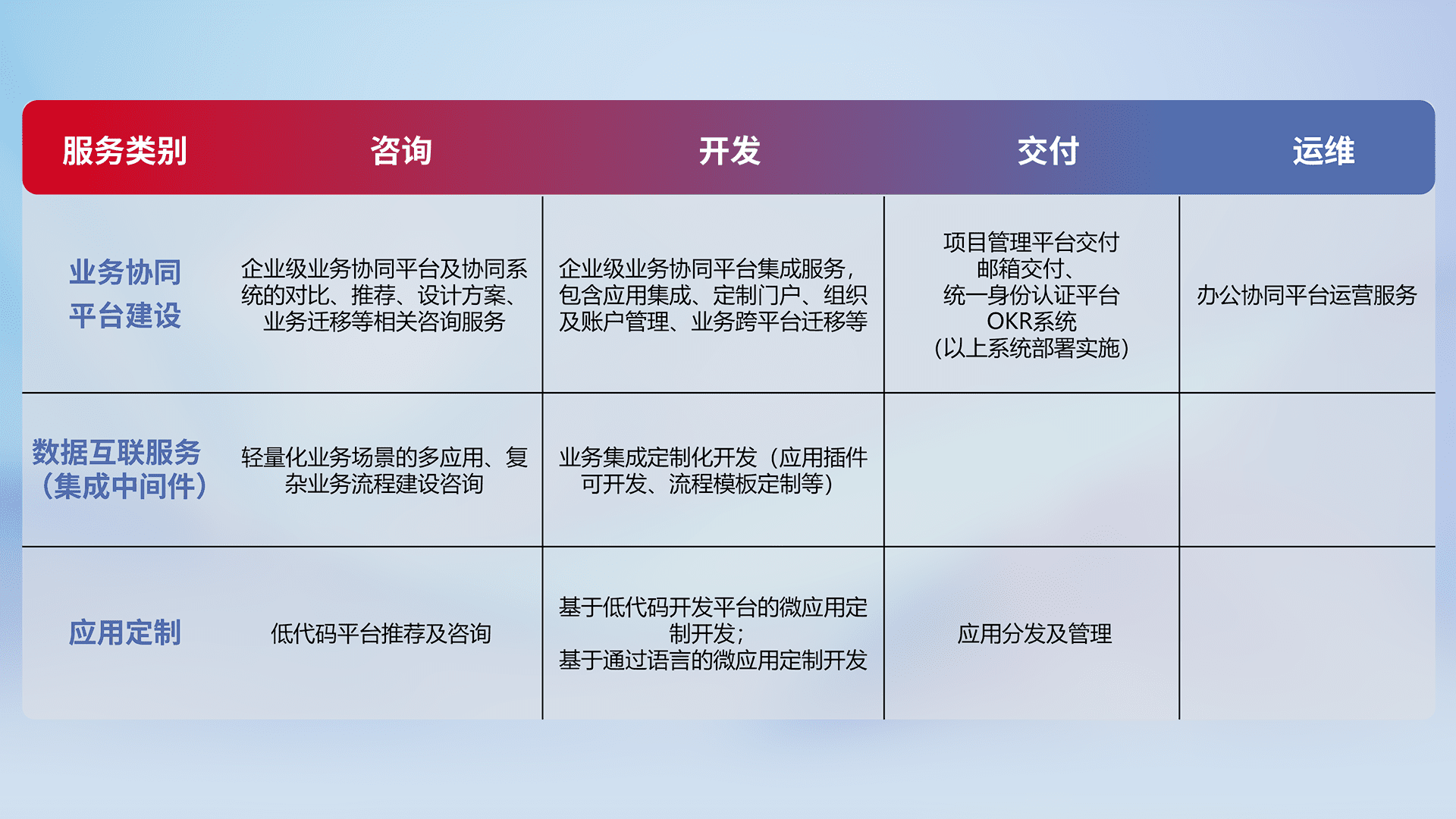针对钉钉、、、企微、、IDaas等平台级产品提供产品的规划、、方案、、、交付、、定制化开发等服务,,实现如统一协同办公、、智能客户服务、、混合会议管理、、、智能数据查询、、、等业务场景,,,,实现数字化转型。。。。